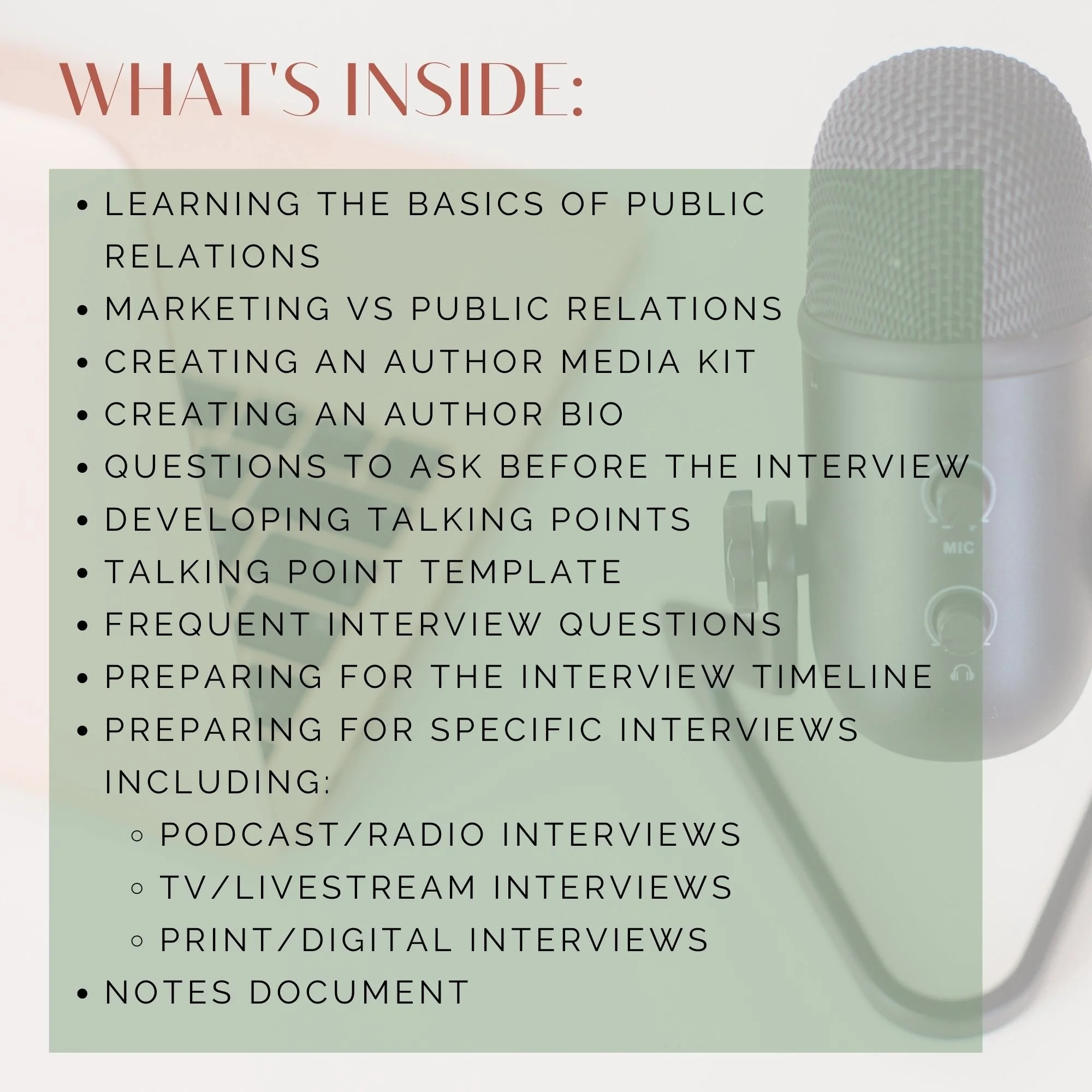 -Preparing for specific interviews including podcast/radio interviews, TV/livestream interviews, and print/digital interviews